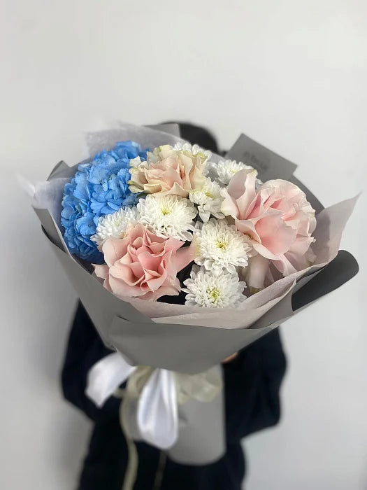 Una mezcla encantadora de hortensias azules, claveles rosados y crisantemos blancos. Dulce, fresco y moderno, ideal para nacimientos, cumpleaños o detalles especiales.