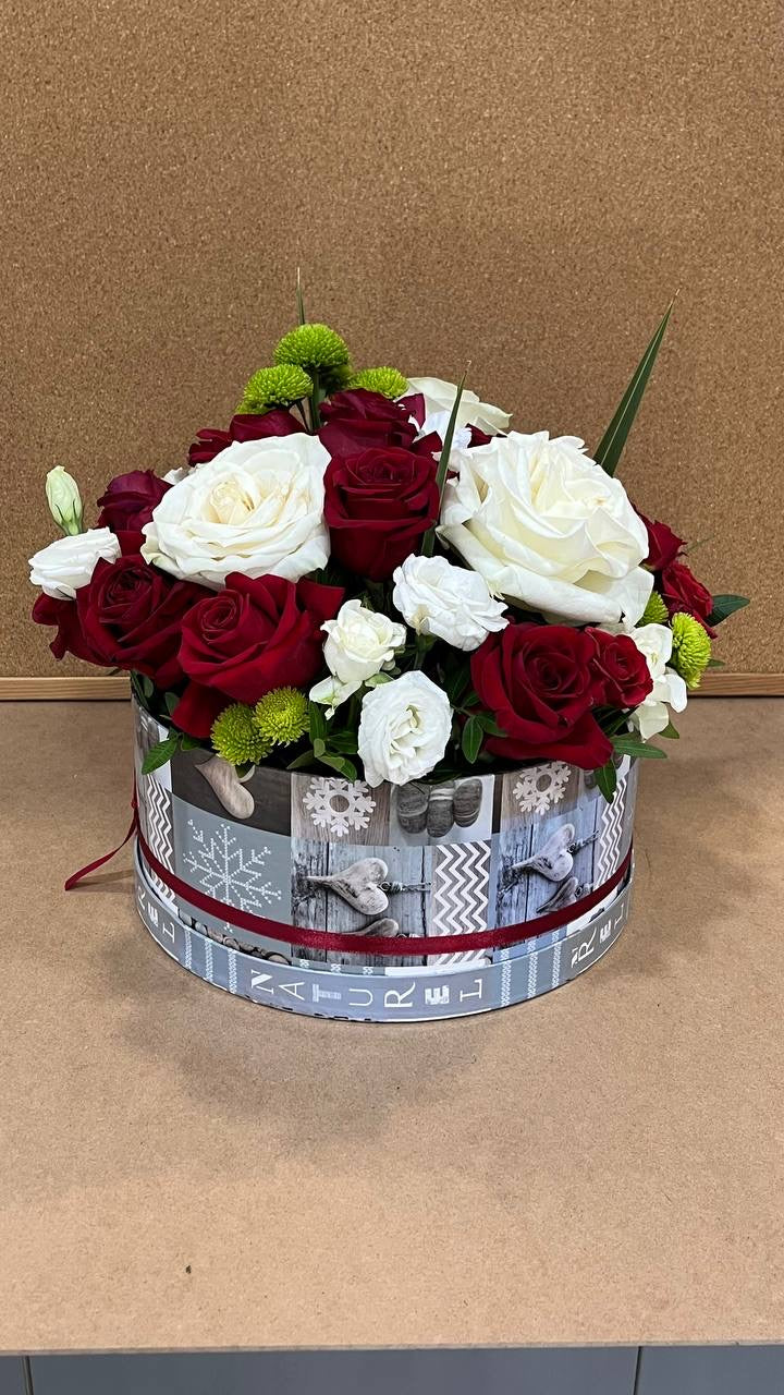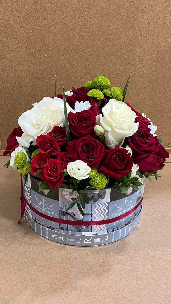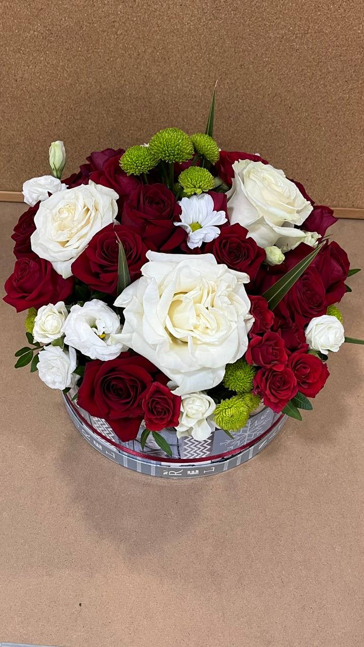 Elegante caja floral con rosas rojas y blancas frescas, cuidadosamente seleccionadas y dispuestas con estilo. Un detalle sofisticado que combina pasión y pureza, ideal para aniversarios, cumpleaños, agradecimientos o momentos románticos.