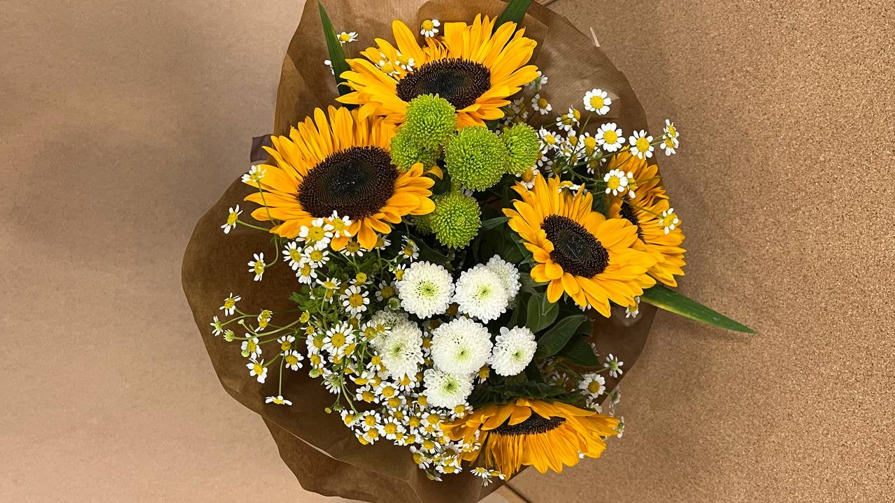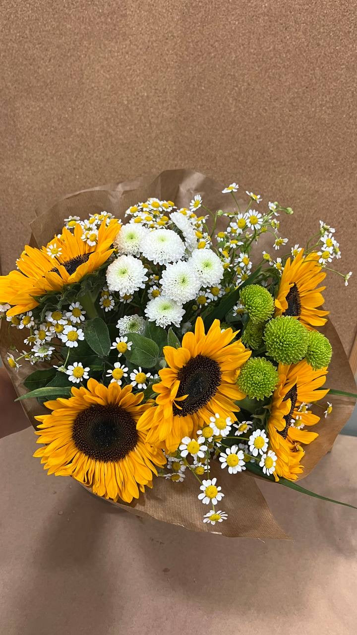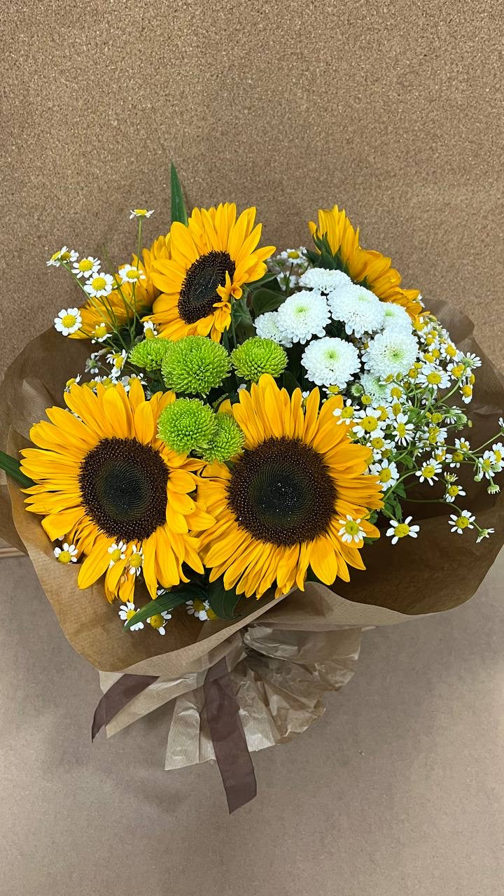 Ramo alegre y luminoso compuesto por girasoles vibrantes, margaritas blancas y follaje verde decorativo. Una combinación fresca y natural que transmite energía, alegría y cariño.